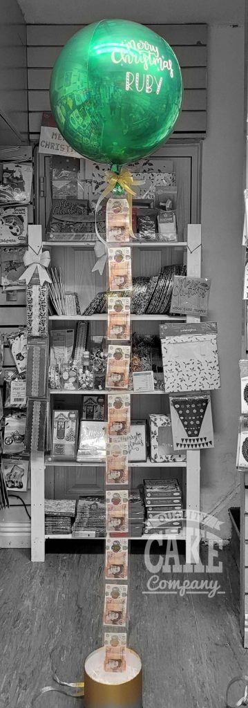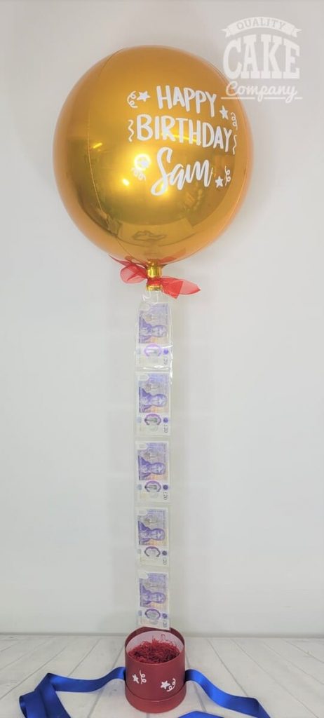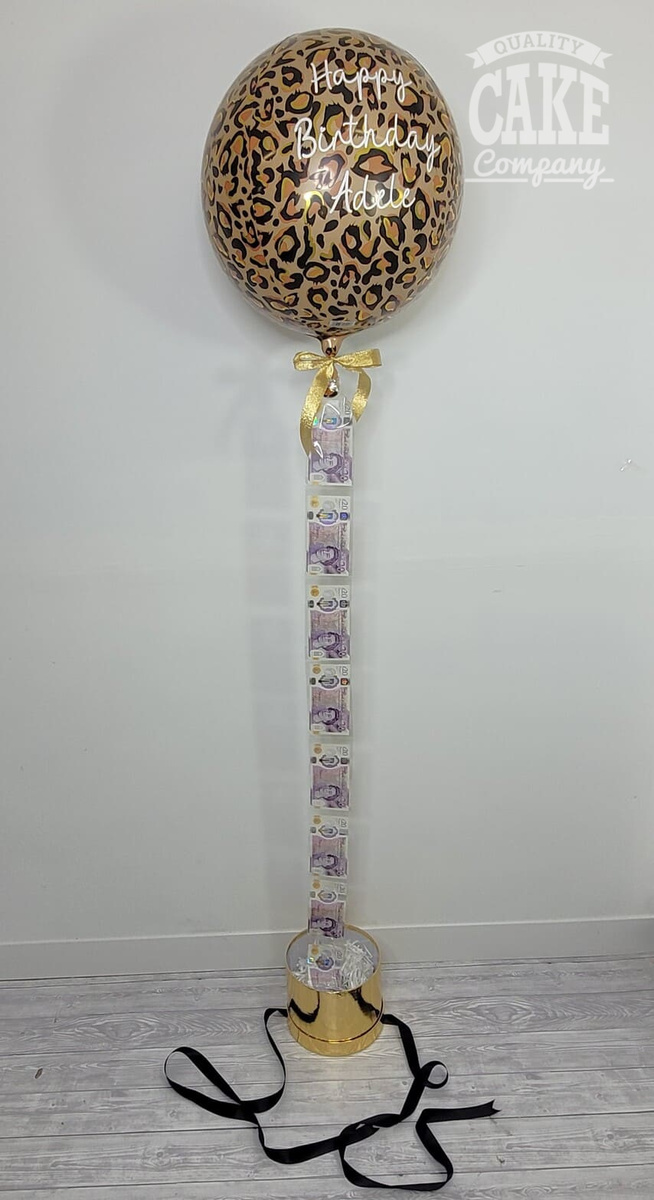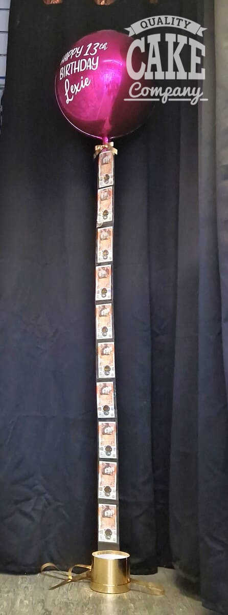 A solid-coloured balloon with a string of money attached to the balloon. Simply untie the ribbon to reveal the money floating underneath.