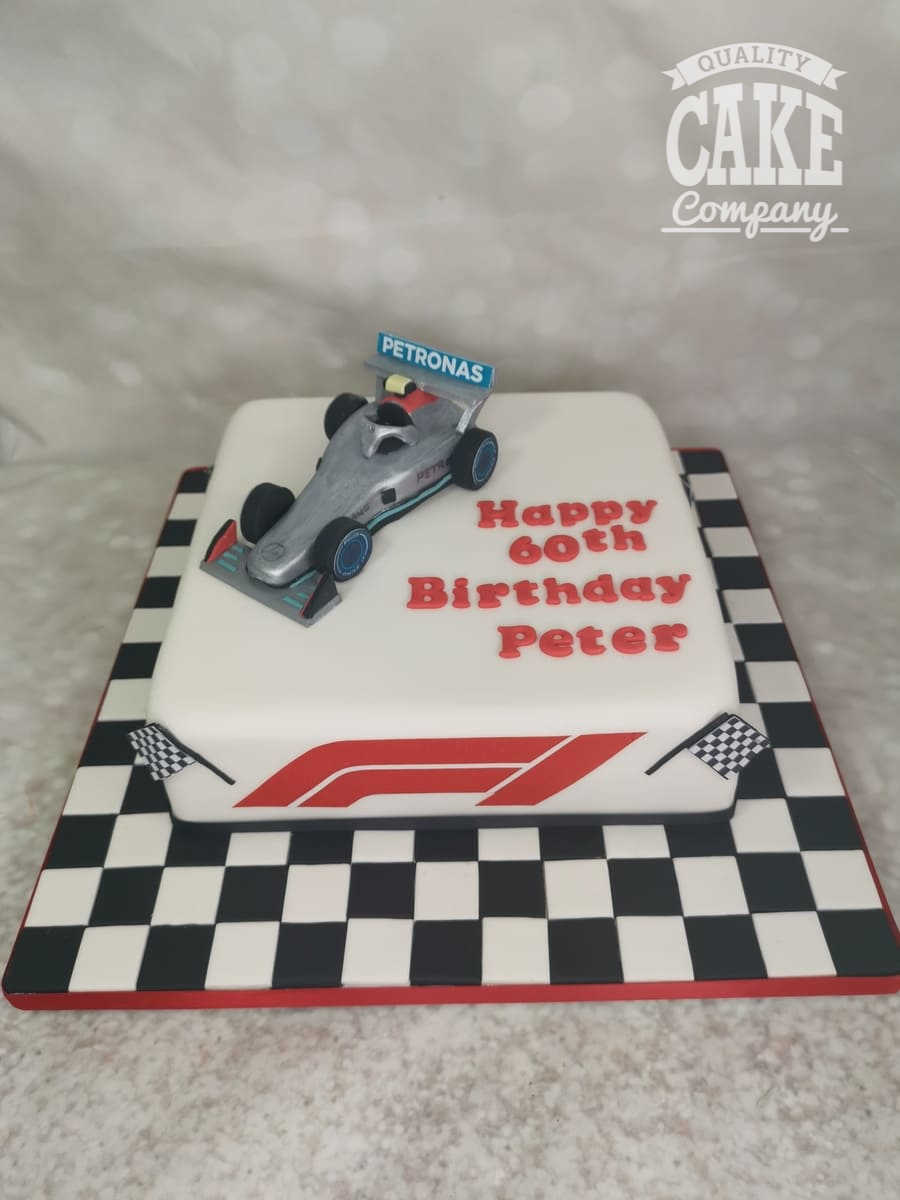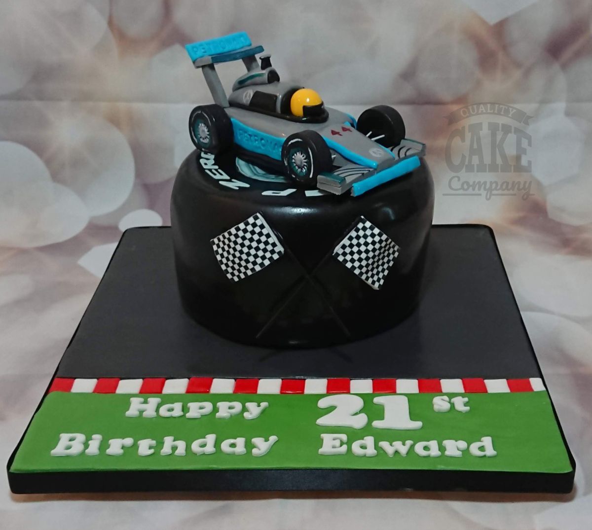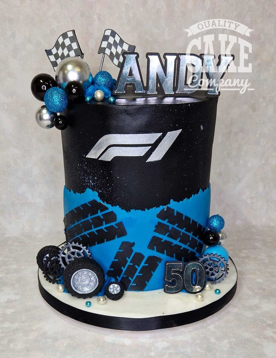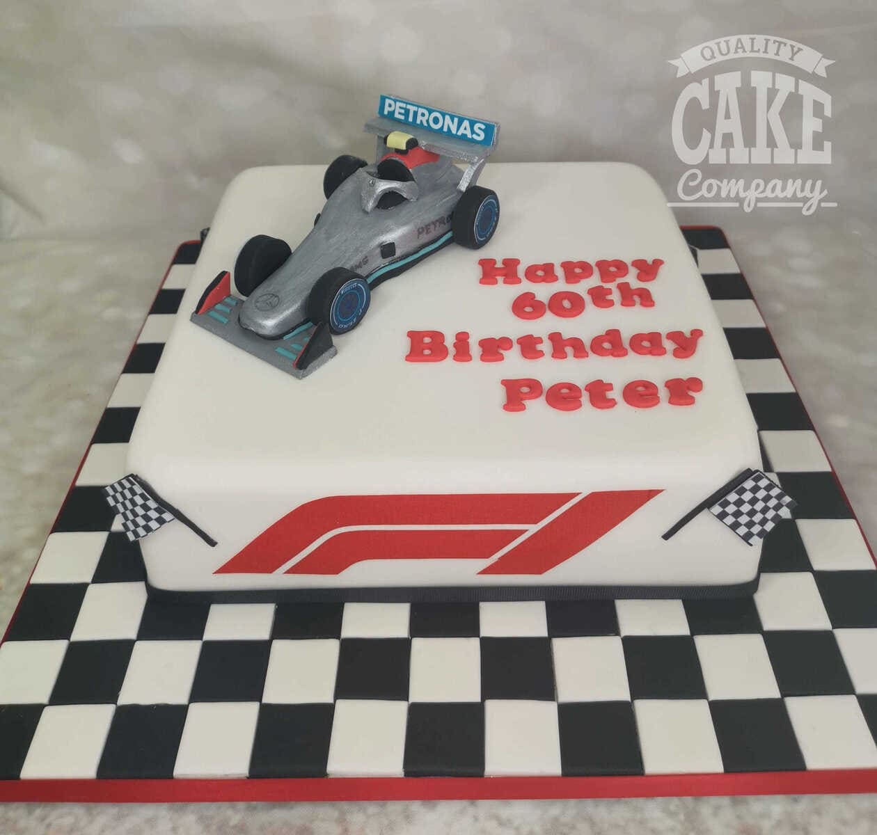 Choose from full 3D F1 car cakes, tiered cakes wrapped with checkered flag patterns, podium-style displays, racing helmets, personalised number plates, and edible toppers inspired by your favourite team or driver.