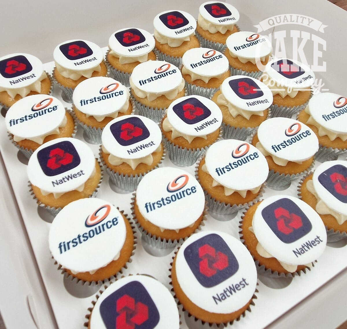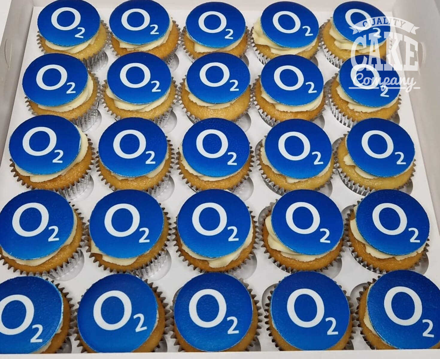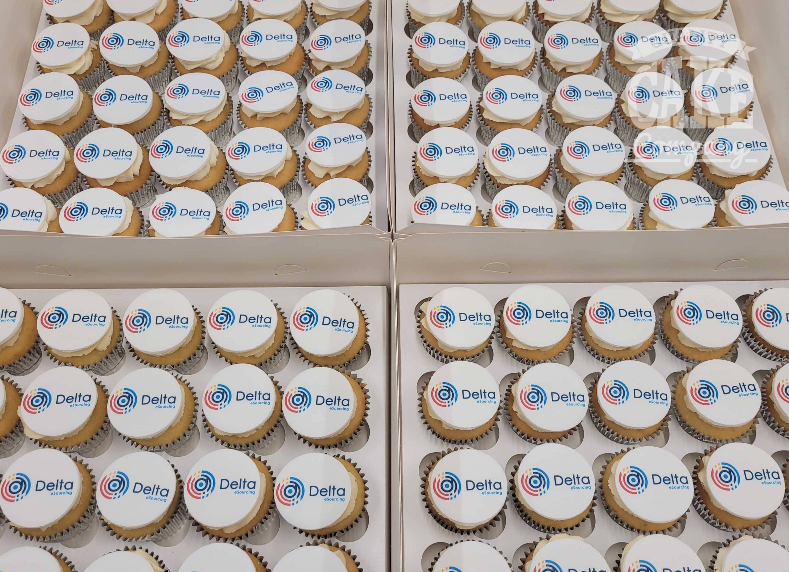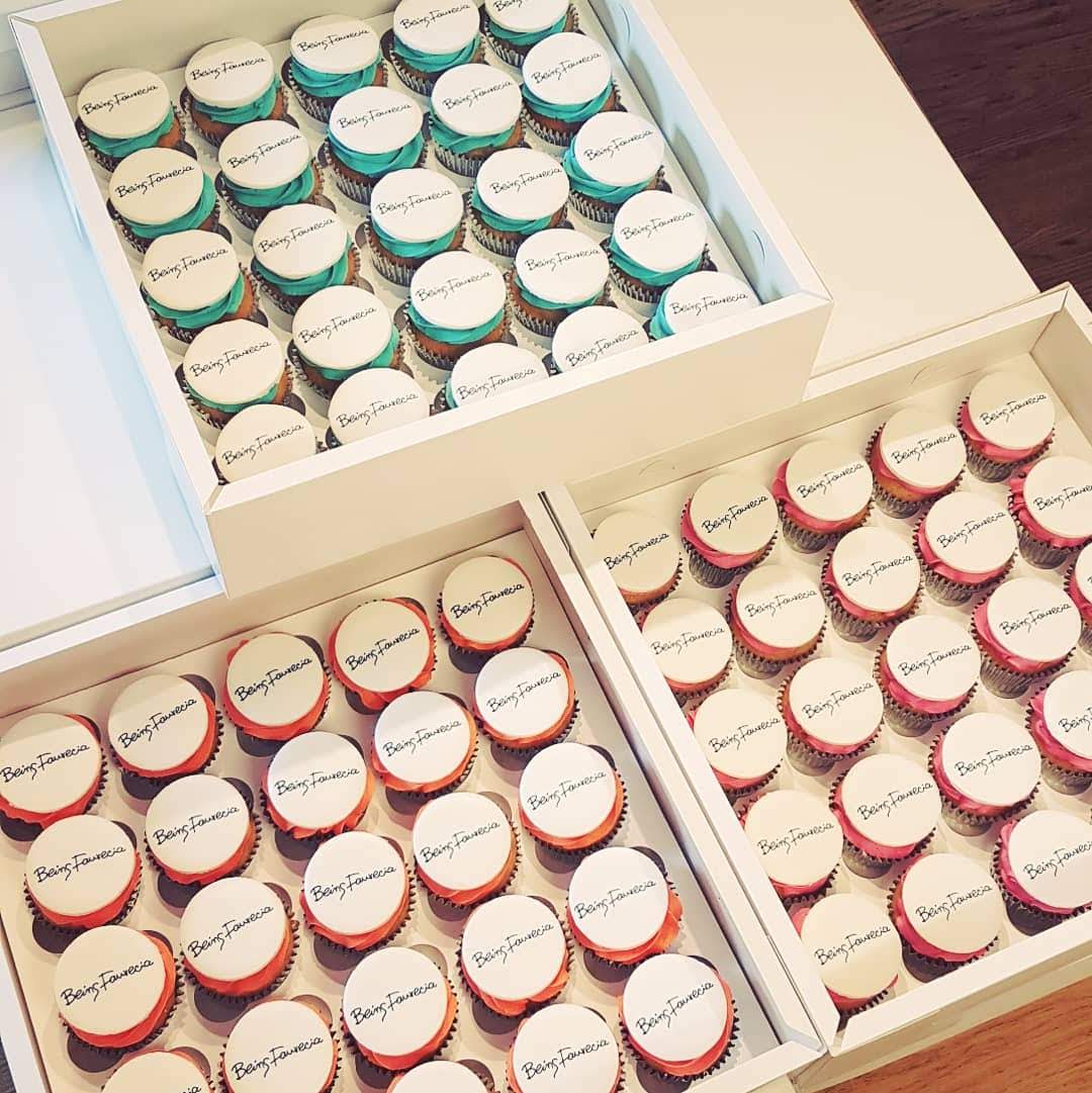 We box the cupcakes into trays of 24/25 (or in 12’s or 16’s), alternatively, we can individually box logo cupcakes for gifts or favours.