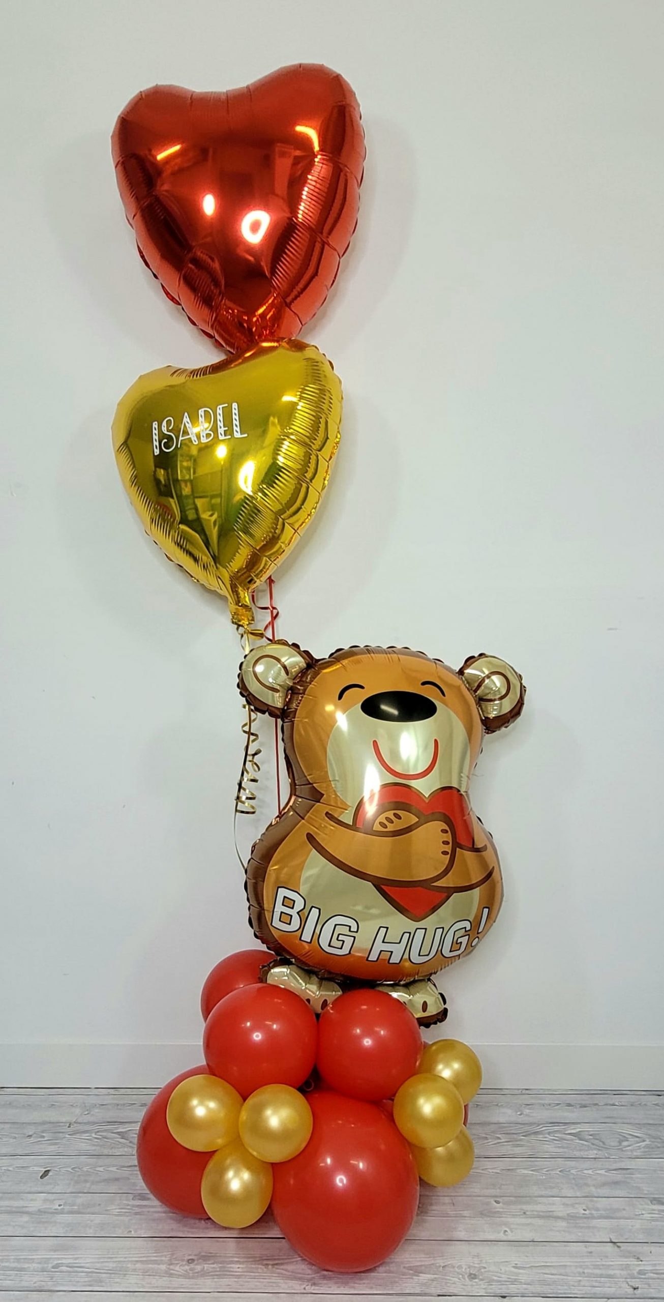 A bright shiny personalised orb hot air balloon with a message or name of your choice, complete with a cute cuddly teddy bear.