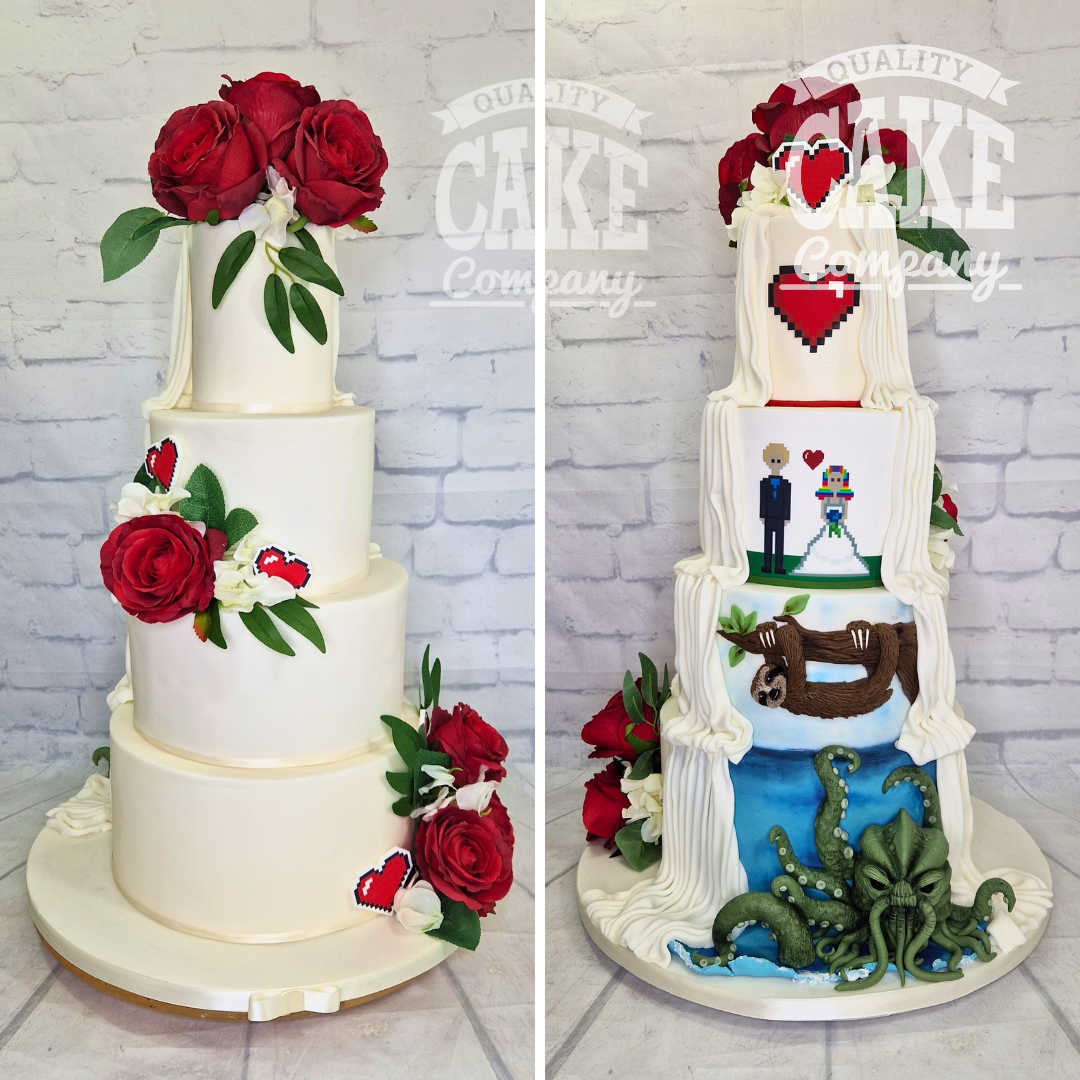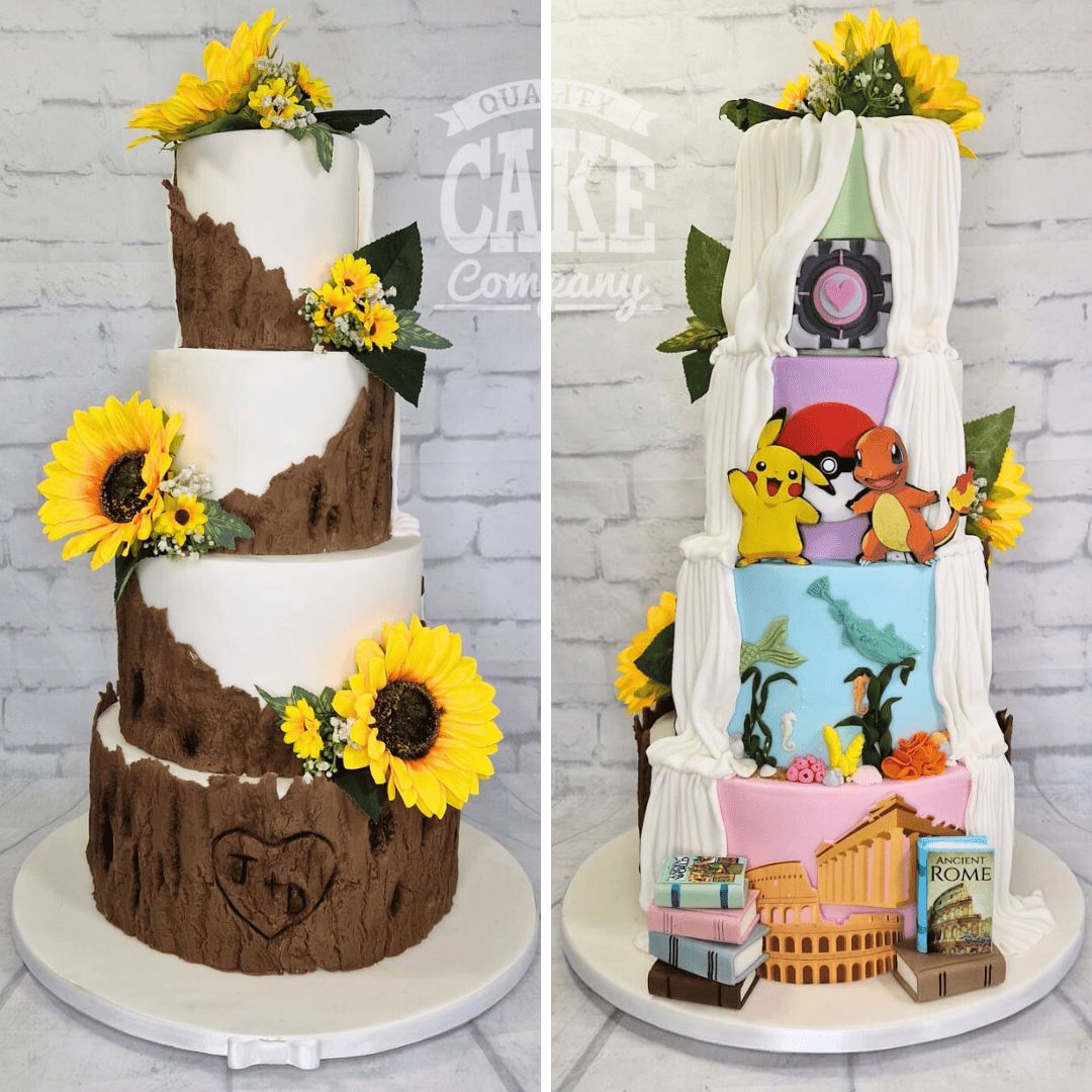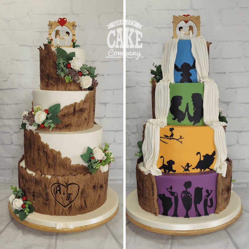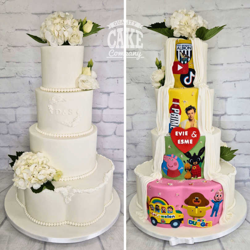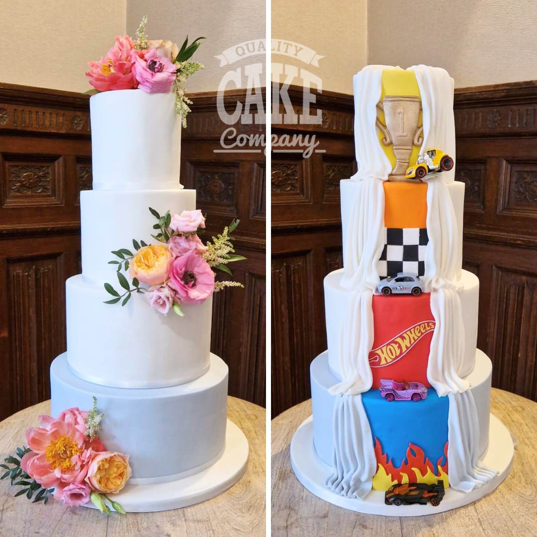 A three, four or even five-tiered cake with a classic design at the front and another completely different design hidden at the back.