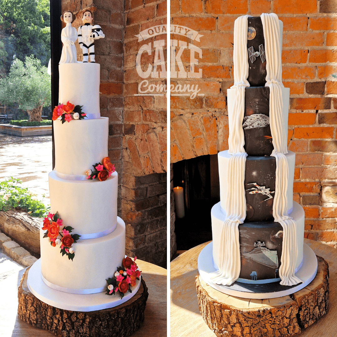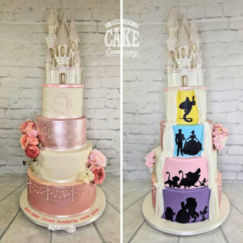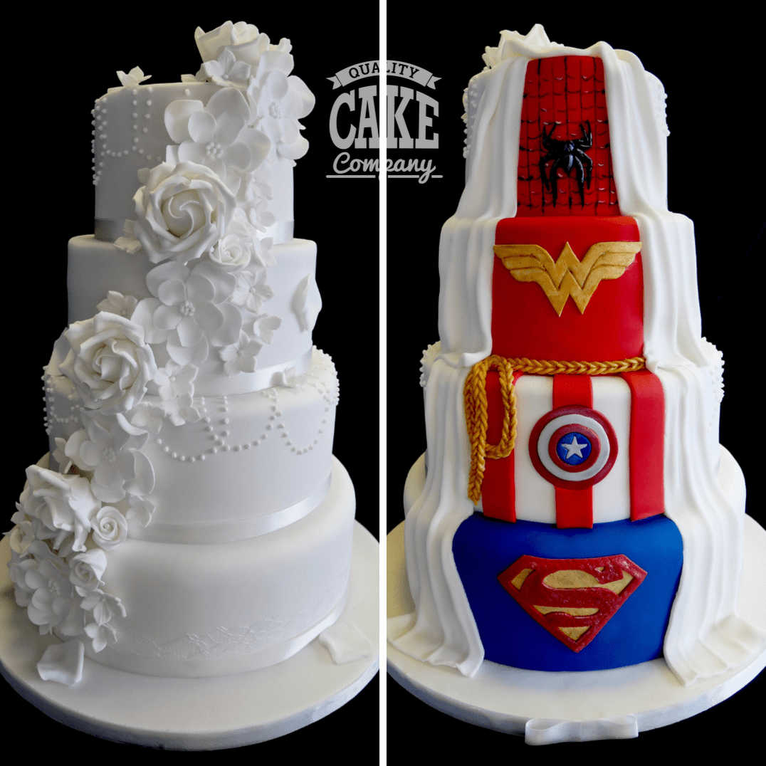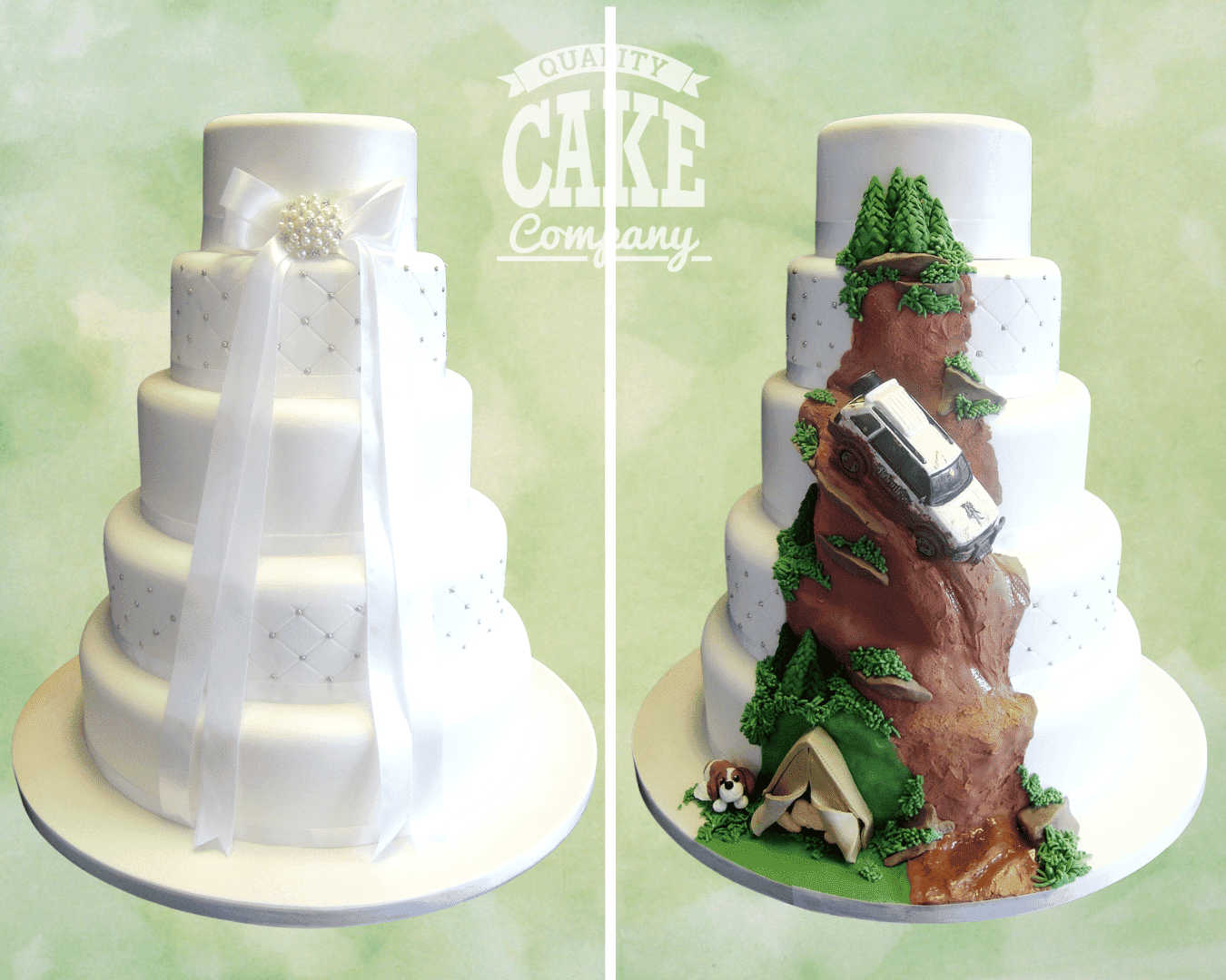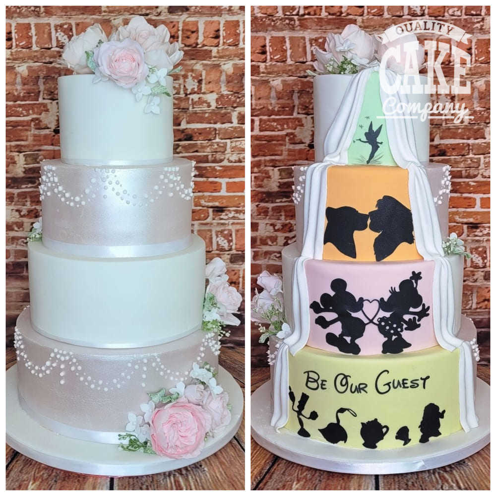 A three, four or even five-tiered cake with a classic design at the front and another completely different design hidden at the back.