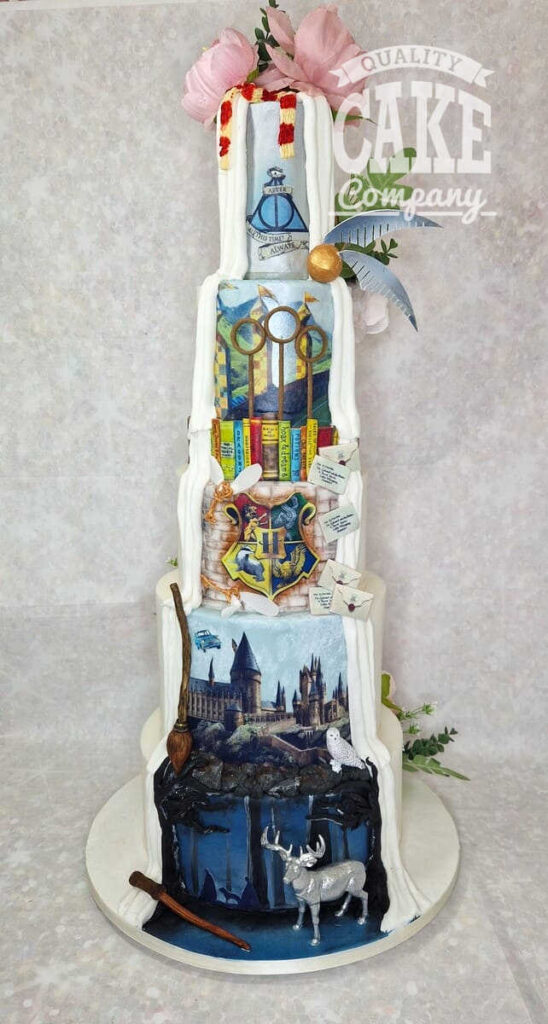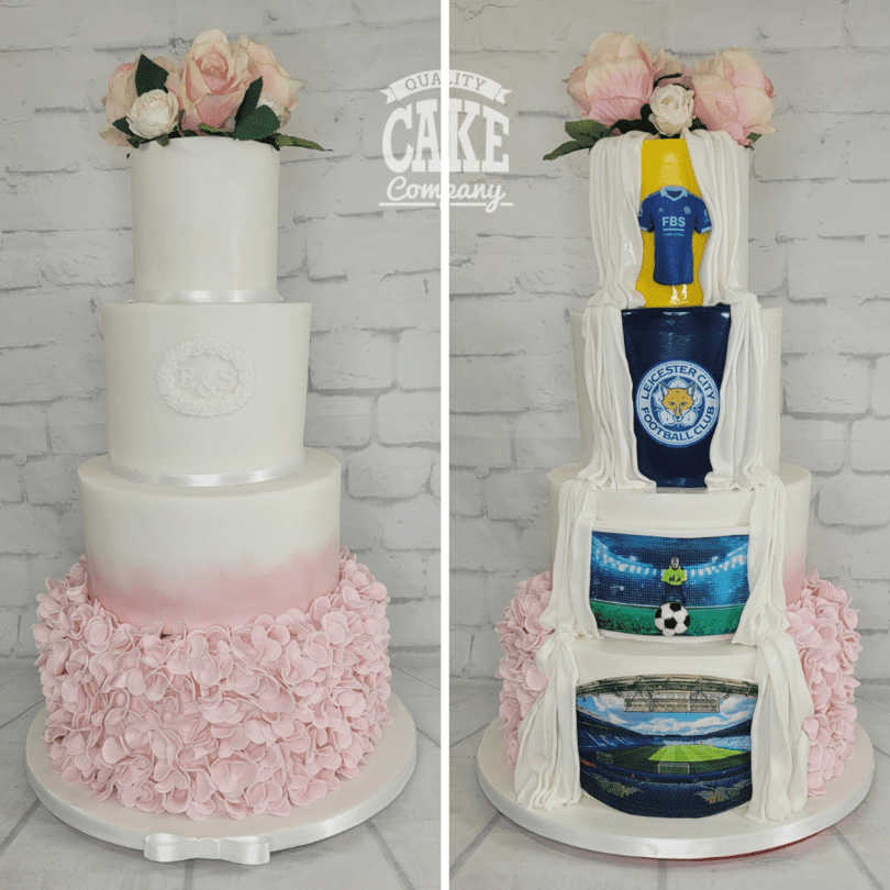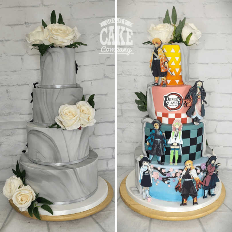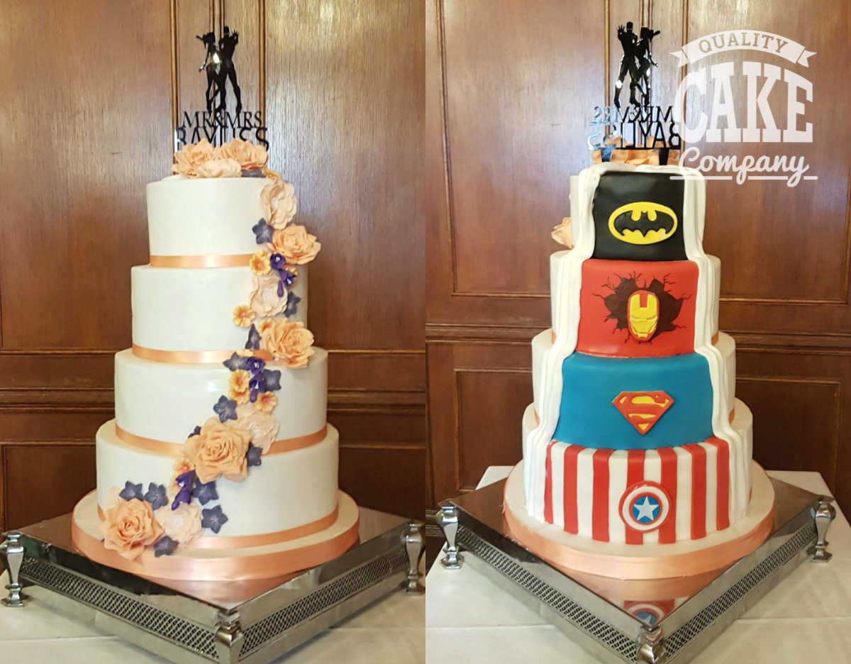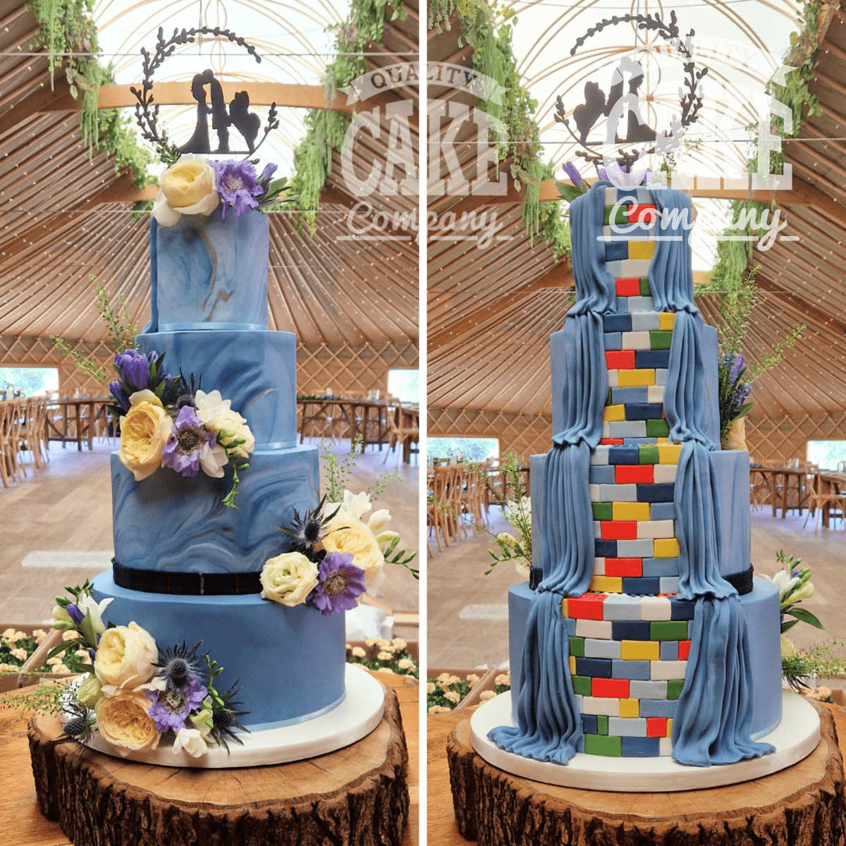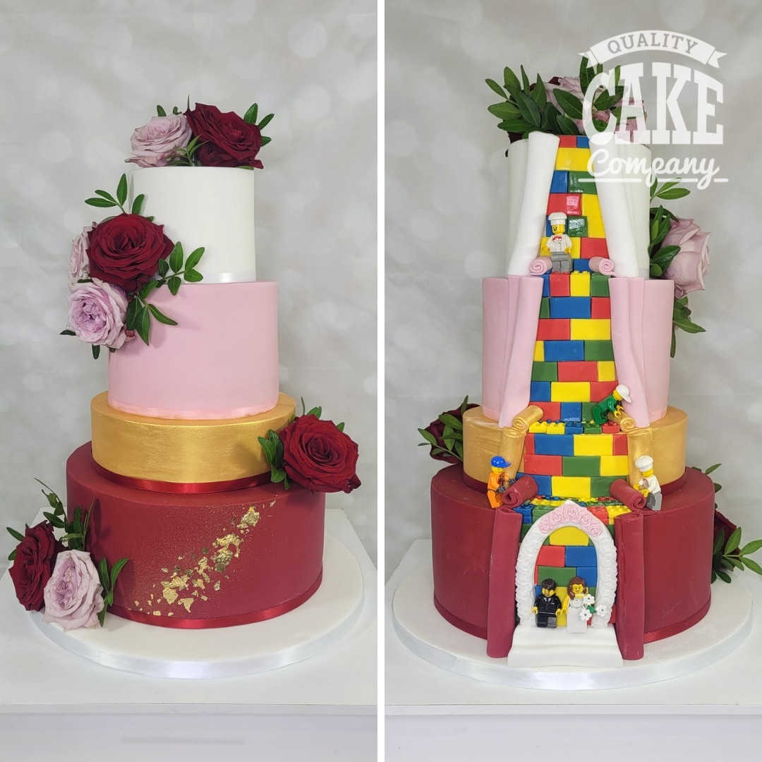 A three, four or even five-tiered cake with a classic design at the front and another completely different design hidden at the back.