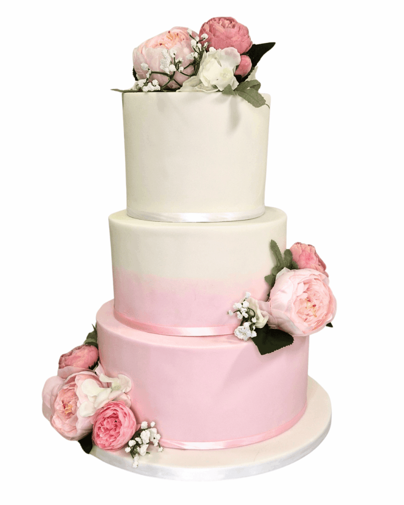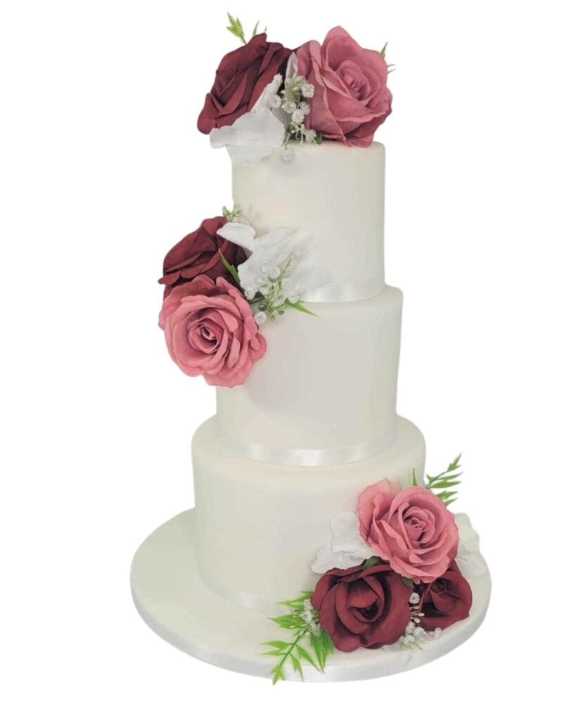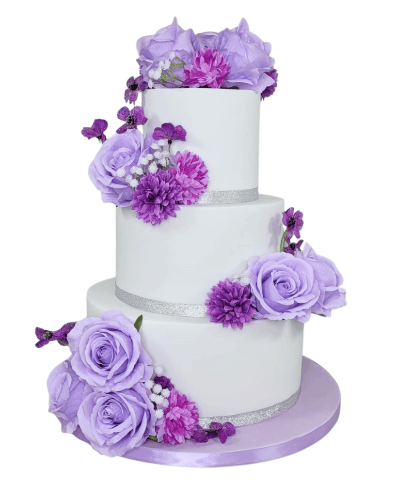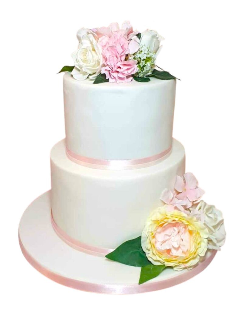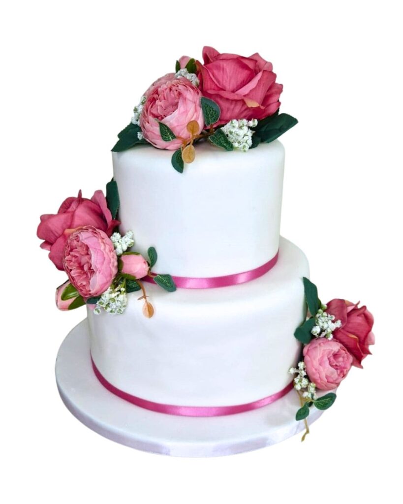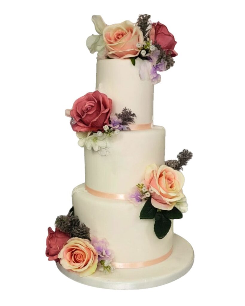 Our silk floral wedding cakes are one of our most popular signature styles — featuring clean, smooth icing paired with carefully arranged silk flowers for a soft, romantic finish.