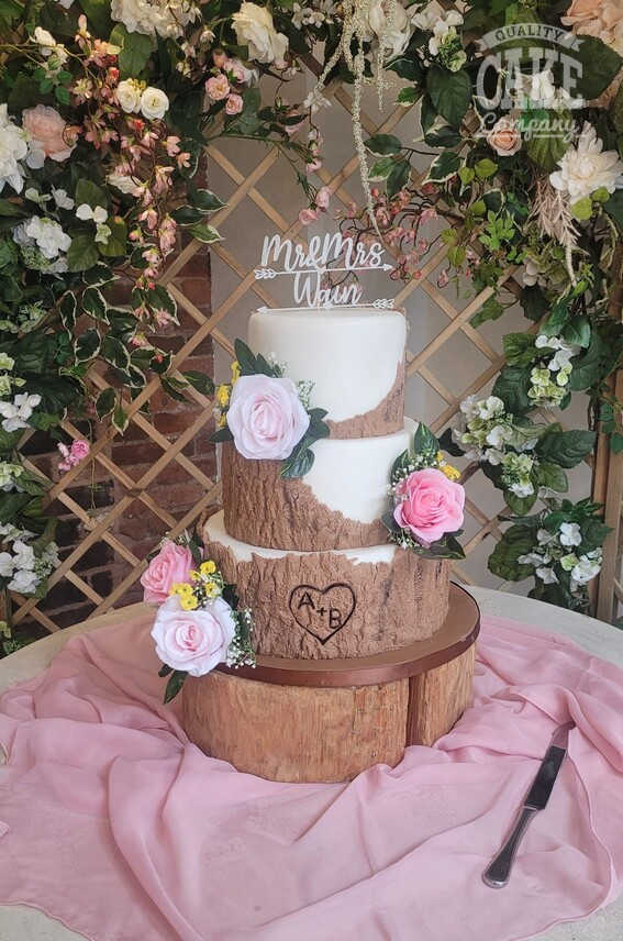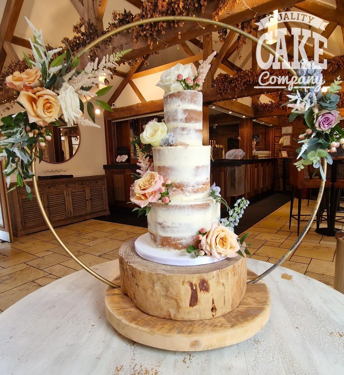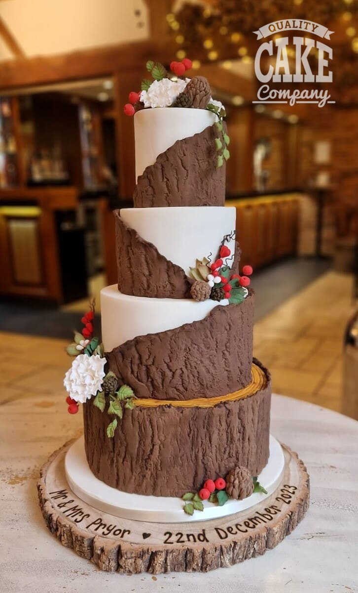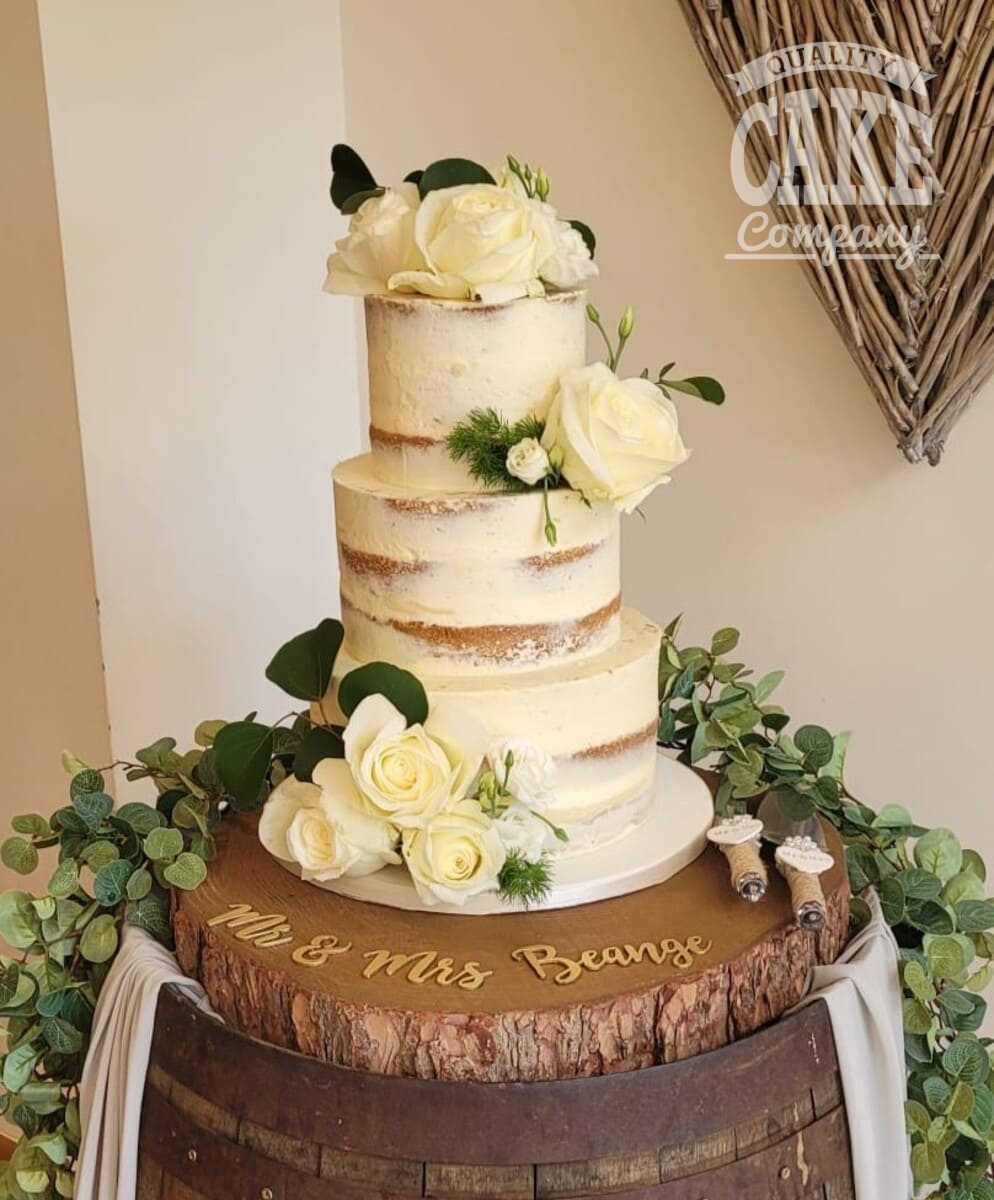 Semi-naked and bark-themed cakes have been the most requested designs at this venue, suiting the the rustic yet contemporary aesthetic. Adding simple flowers, or foliage helps tie the inside and outside together into a beautiful cake.