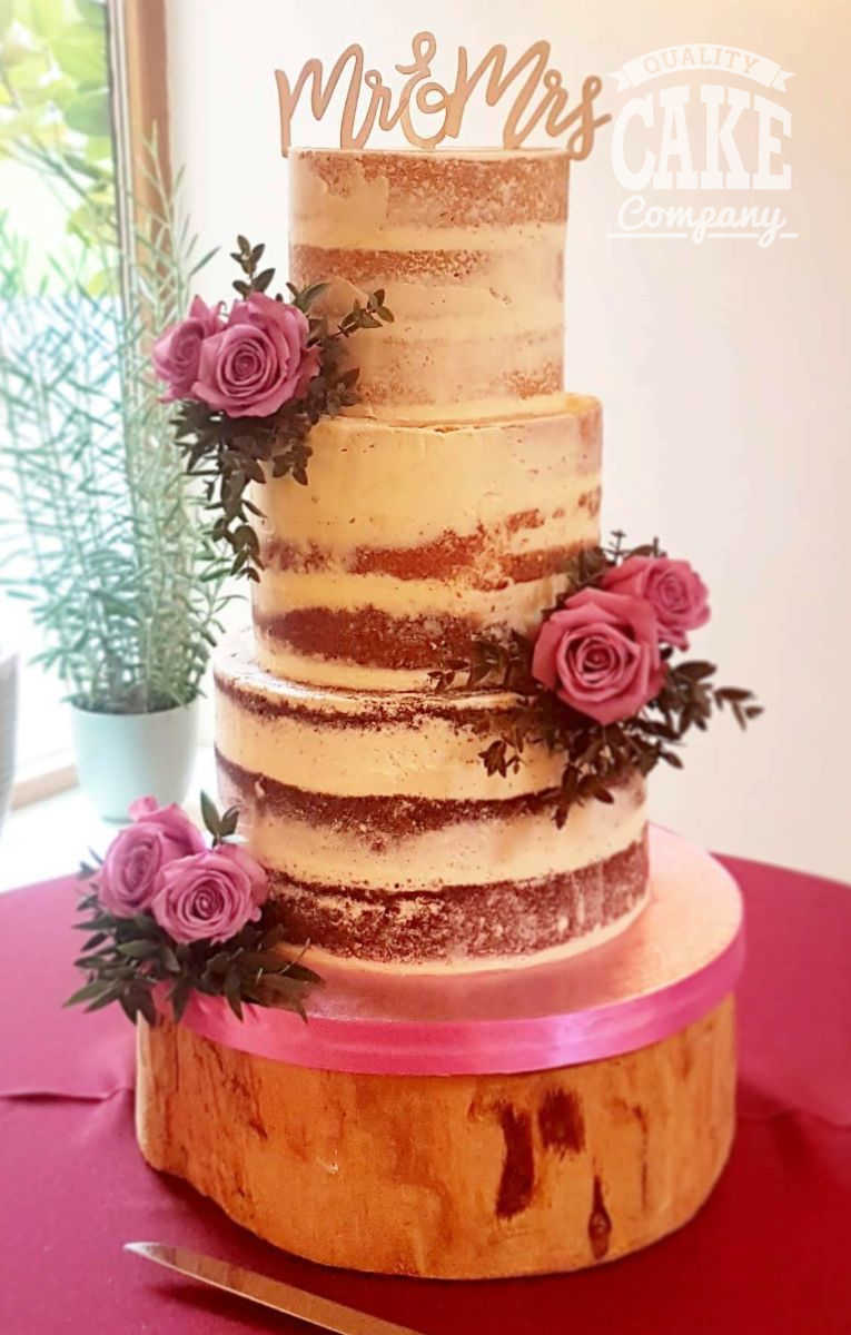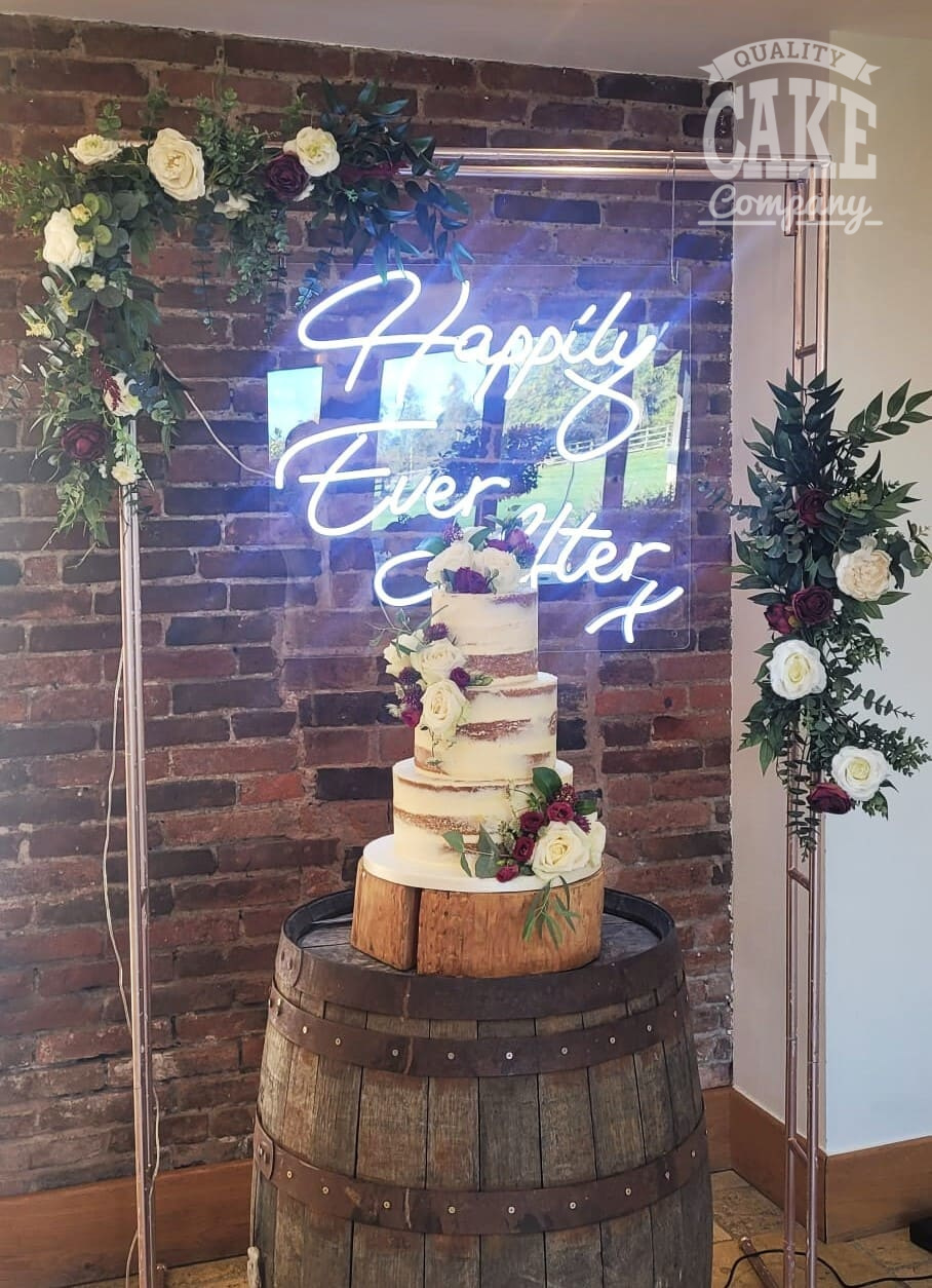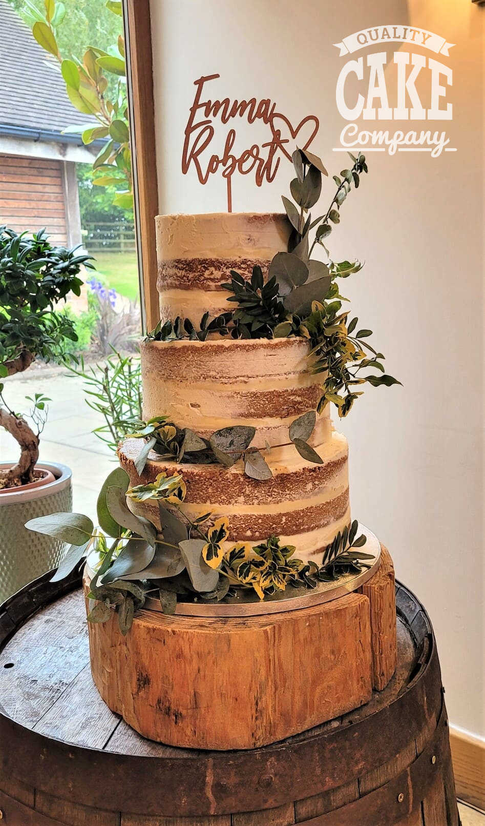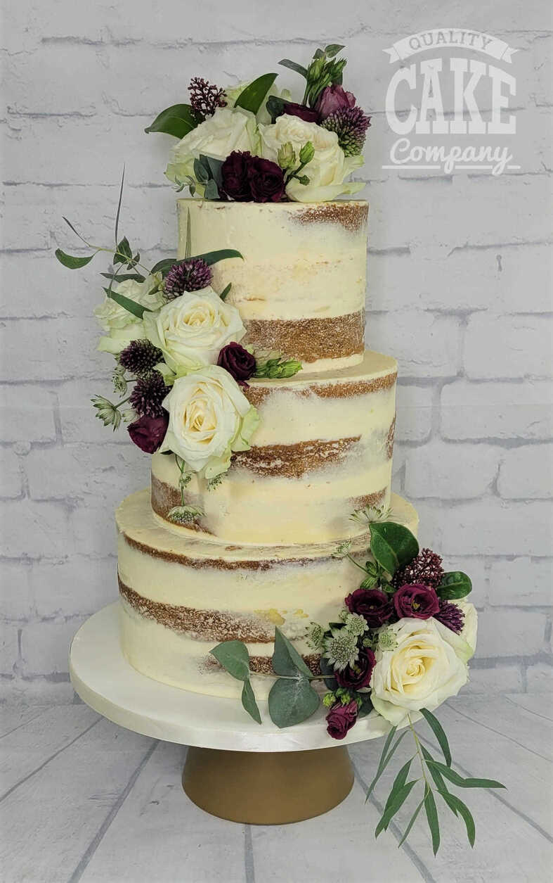 Semi-naked and bark-themed cakes have been the most requested designs at this venue, suiting the the rustic yet contemporary aesthetic. Adding simple flowers, or foliage helps tie the inside and outside together into a beautiful cake.