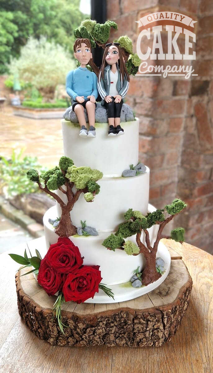 Semi-naked, buttercream and bark-themed cakes have been the most requested designs at this venue, fitting in well with the rustic yet contemporary aesthetic. Adding simple flowers, or foliage helps tie the inside and outside together into a beautiful cake.