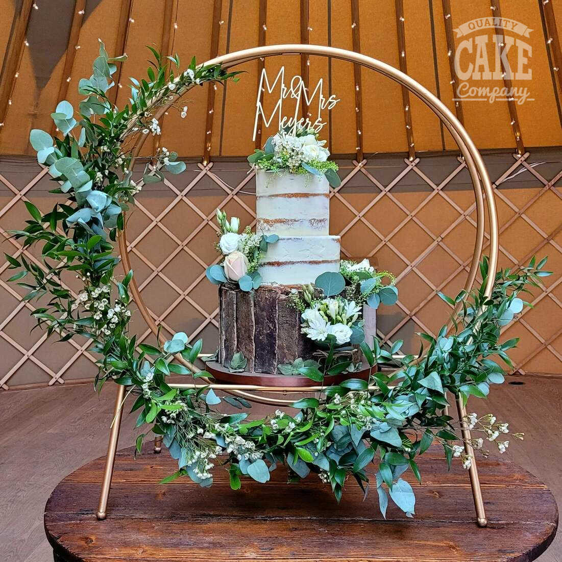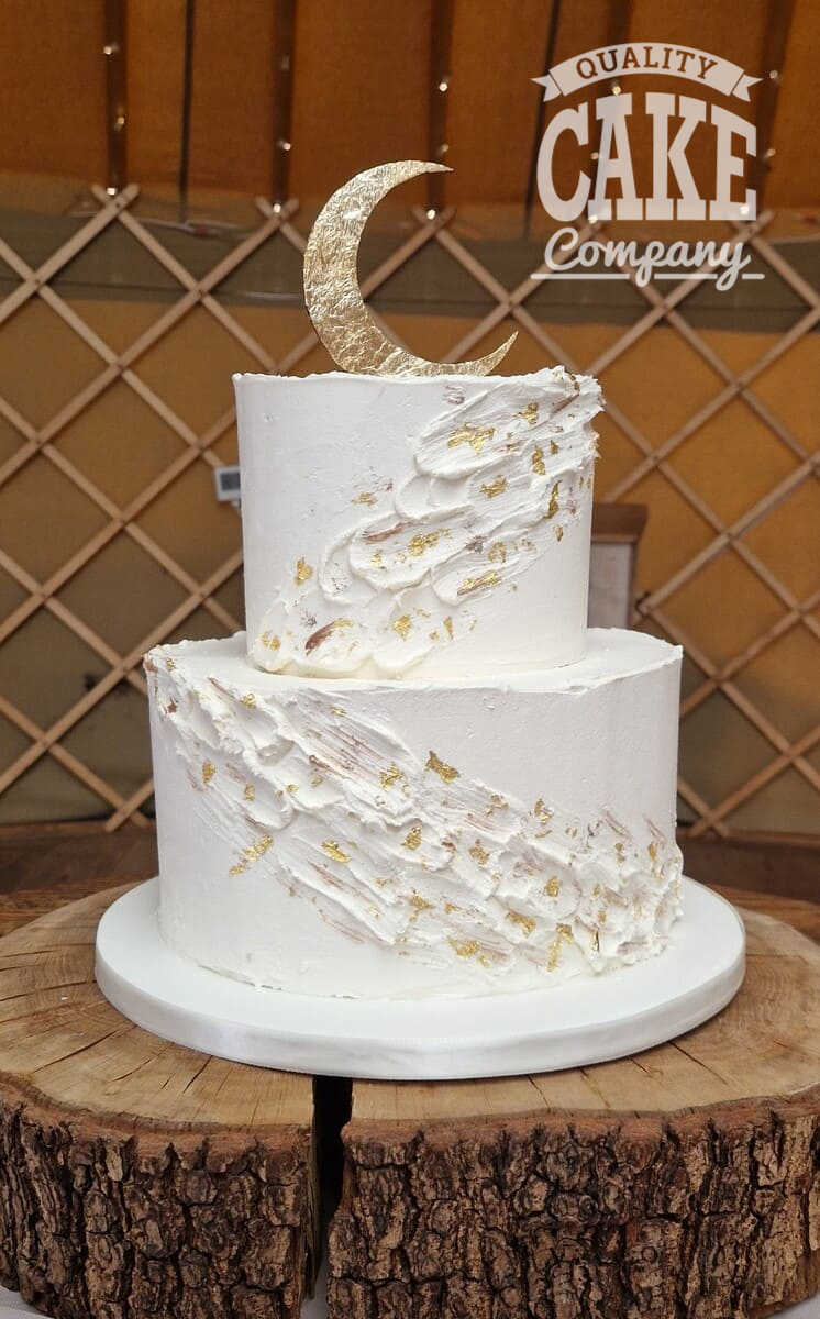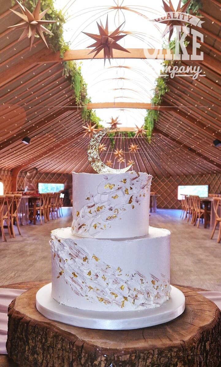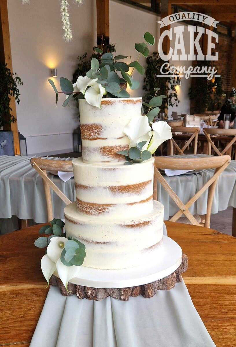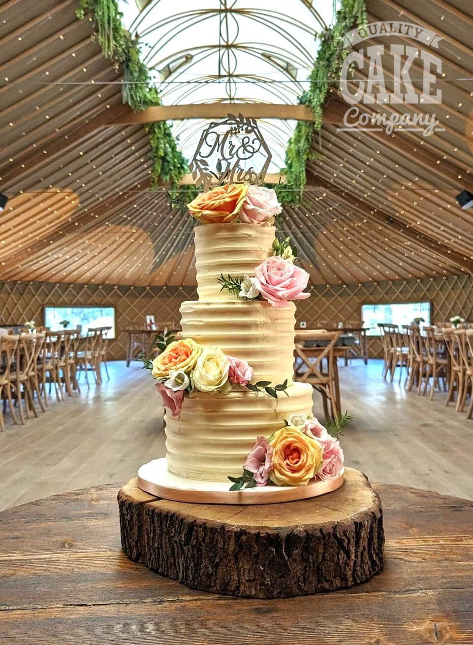 Semi-naked, buttercream and bark-themed cakes have been the most requested designs at this venue, fitting in well with the rustic yet contemporary aesthetic. Adding simple flowers, or foliage helps tie the inside and outside together into a beautiful cake.