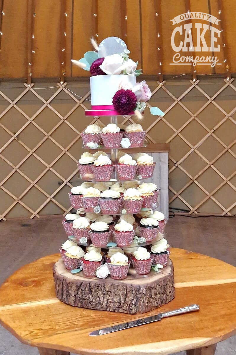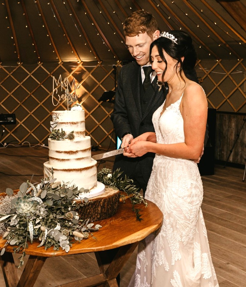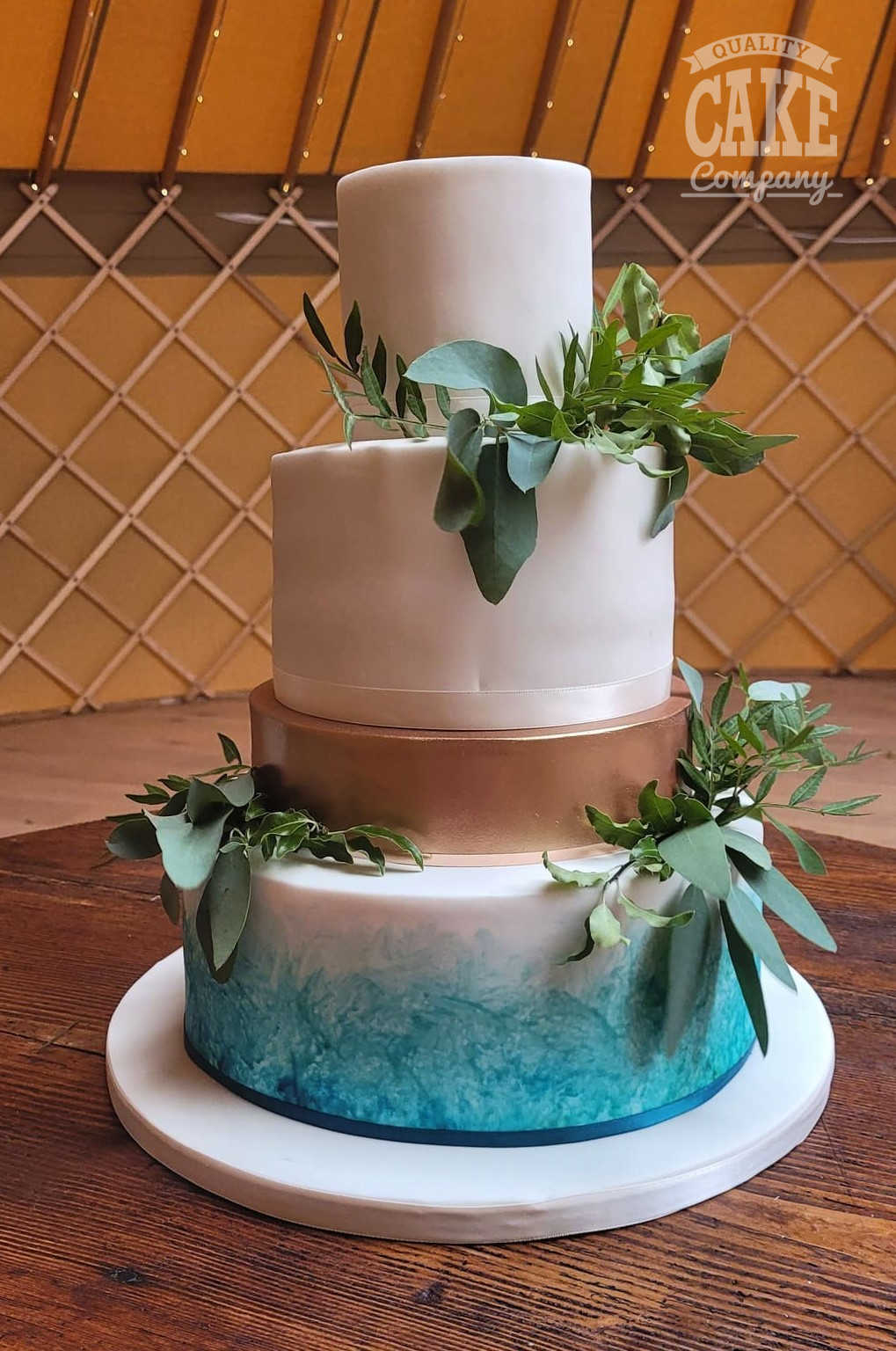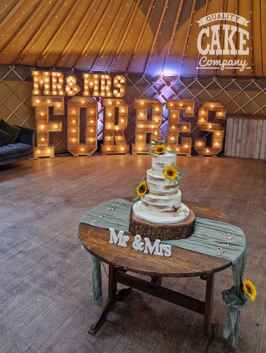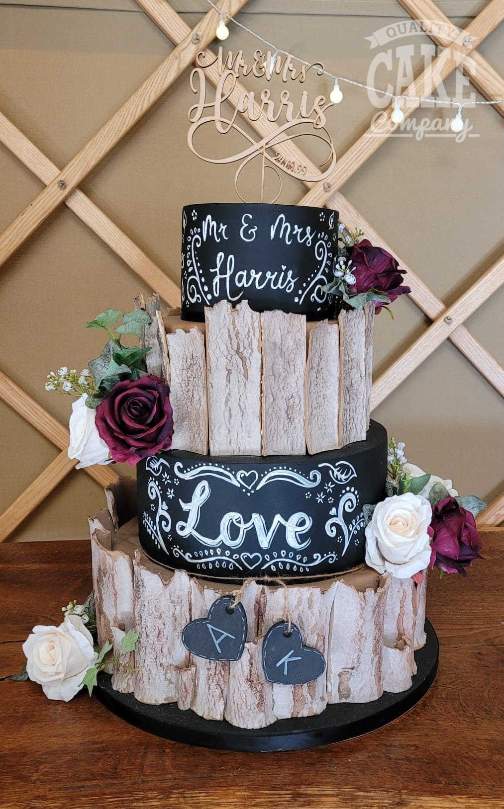 Semi-naked, buttercream and bark-themed cakes have been the most requested designs at this venue, fitting in well with the rustic yet contemporary aesthetic. Adding simple flowers, or foliage helps tie the inside and outside together into a beautiful cake.