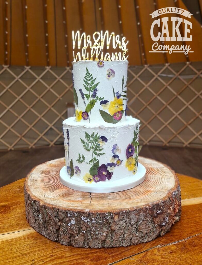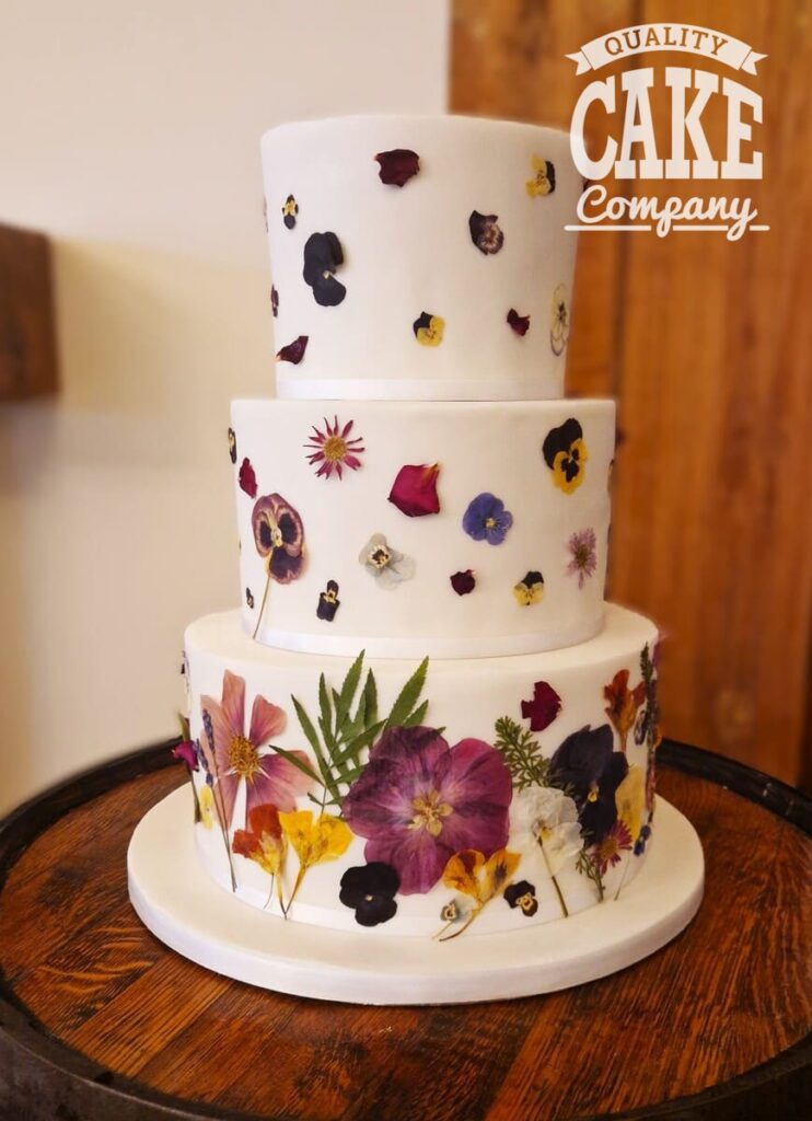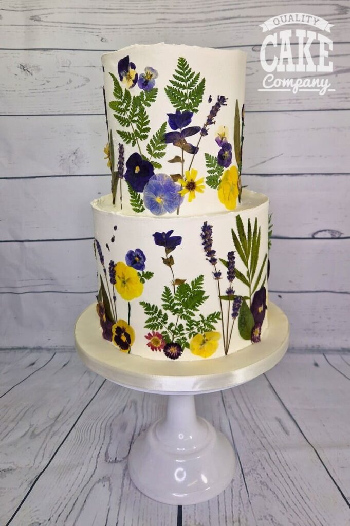 Pressed flowers are real flowers that have been dried, flattened, and preserved to create a colourful, modern, rustic decoration for your cake.